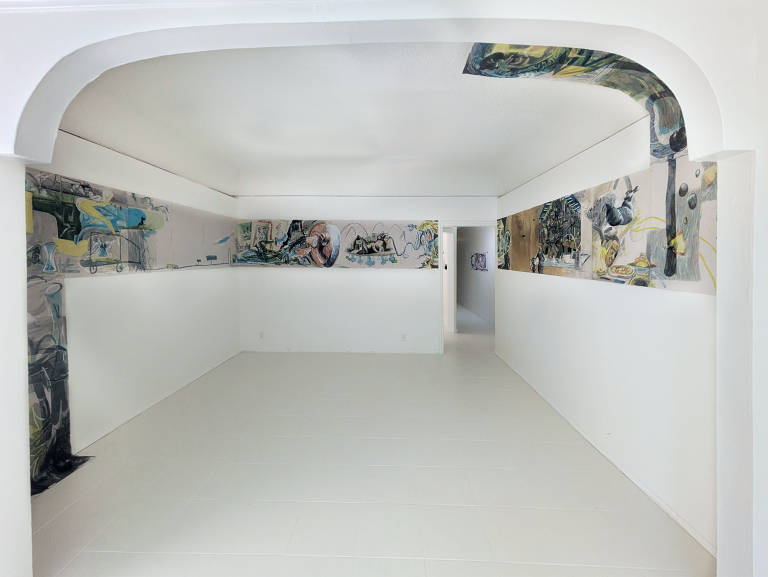 Utopia on the Spectrum (Thomas Mores' Loose Threads), ink, colored pencil, oil pastel, inkjet prints and gouache on paper, 90" x 280", 2022